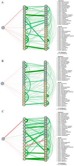 Figure 4. Flow network of life satisfaction. (A), Flow network of all participants. (B), Flow network of the low-neuroticism group. (C), Flow network of the high-neuroticism group.