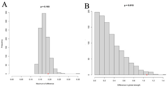 Figure 5. Network comparison between the low-neuroticism group and high-neuroticism group. (A) Edge weights invariance. (B) Global strength invariance.