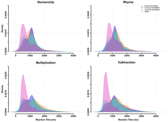 Figure 2 for each task (across difficulty levels) and for each age group. This figure confirms the presence of a bimodal distribution for each task, but with some differences between the age groups. For all ages and all tasks, a first RT peak appeared around 600 ms (except for the 8- to 9-year-old children, who did not show this first peak for the numerosity and subtraction tasks) and a second peak around 1100 ms, with a trough latency around 900 ms. This trough latency was measured for each age group in each task as the lowest density point between the two unimodal sub-distributions. The relative density in each peak, however, changed with age: the second peak was highest during childhood but decreased progressively in favor of the first peak, which became largely predominant in adults.