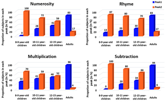 p = 0.05). In adults, post hoc tests pointed to a non-significant trend toward a higher proportion of fast responders in the multiplication and subtraction tasks than in the numerosity and rhyme tasks.