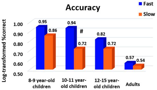 Figure 3, almost all 8–9-year-old children were classified as slow responders (orange distributions). The number of fast responders (blue distributions) increased from 10–11 to 12–15 years of age without reaching adult level. Indeed, nearly all adults were fast responders.