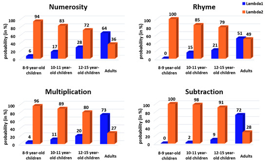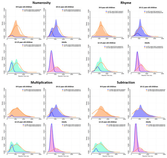 Figure 6, the modeling found two Gaussian distributions with associated lambda values (see the following paragraph), except for the 8- to 9-year-old children in rhyme and subtraction, where only the long latency Gaussian was disclosed. This indicates a zero probability of being a fast responder in these two conditions. These modeling results suggest that slow and fast responders do use separate decision processes, confirming our classification results based on the raw data using the trough of population-level RT distribution (see above).
