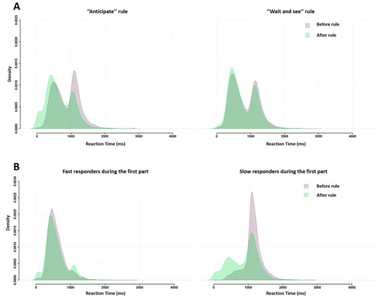 Figure 8B) show that, before the rule, the proportions of fast and slow responders were roughly even, showing the same fast/slow 55/45 ratio as in Tricoche et al. (2021). After the rule, however, the first peak increased (at the expense of the second one;