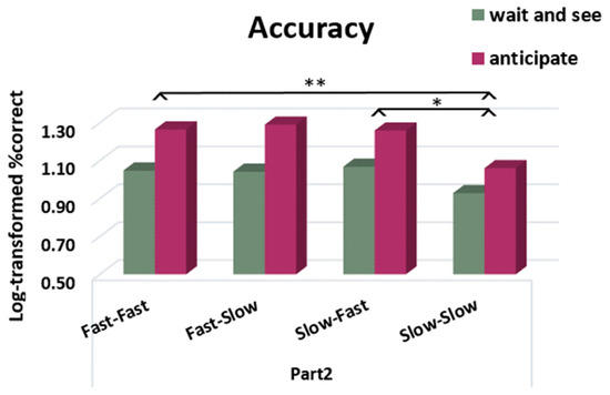 We conducted a repeated-measures ANOVA on the percentage of correct responses before and after the rule was given (Part 1 and Part 2) using the rule (“anticipate”, “wait and see”) and profile pattern (fast/fast, slow/slow, fast/slow, slow/fast) as between-subject factors. We found a main effect of rule (F (1228) = 16.13,