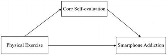 At the theoretical level, the cognitive-behavioral model of pathological internet use proposed by Davis puts forward that individual inappropriate self-cognition, such as self-doubt and negative self-evaluation, are risk factors leading to the emergence and development of internet addiction [35]. Smartphone addiction and internet addiction are both non-drug addictions or behavioral addictions. Since the smartphone itself is a new type of internet medium, and individuals use their smartphones for activities such as information gathering, online communication, and online games, there may be similar addiction mechanisms between smartphone addiction and internet addiction. Based on the cognitive-behavioral model, we suppose that, on the one hand, core self-evaluation, as a cognitive factor, may have a negative predictive effect on smartphone addiction in college students, and the lower an individual’s core self-evaluation is, the more likely he or she is to be addicted to smartphone; on the other hand, physical exercise, as a normalized and non-threatening life event, may have an impact on smartphone addiction through an individual’s cognitive processes (e.g., core self-evaluation). To sum up, it can be reasonably speculated that physical exercise may indirectly affect smartphone addiction, where core self-evaluation may be the mediating variable. A recent empirical study shows that physical exercise has a positive predictive effect on core self-evaluation [36]. Furthermore, core self-evaluation has a negative predictive effect on mobile phone addiction [37,38,39,40]. In addition, it is shown that core self-evaluation plays mediating effects in many relationships, through which loneliness has an impact on college students’ mobile phone addiction [41], and technological interference has an impact on teenagers’ smartphone addiction [42]. Therefore, this study puts forward the following hypothesis: