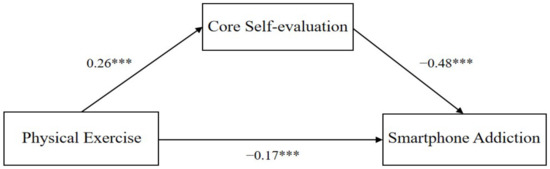 The regression analysis results in Figure 2 (*** p < 0.001) reveal that physical exercise has a significant positive prediction effect on core self-evaluation (β = 0.26, t = 6.32, p < 0.001) and core self-evaluation has significant negative prediction effect on smartphone addiction (β = −0.48, t = −13.90, p < 0.001). Physical exercise is shown to have a significant negative prediction effect on smartphone addiction among college students after adding core self-evaluation as a mediator variable (β = −0.17, t = −4.52, p < 0.001).