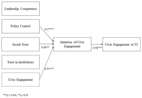 | 7. Intention of Civic Engagement T1 | 0.67 ** | 0.54 ** | 0.20 ** | 0.47 ** | 0.18 ** | 0.19 ** |