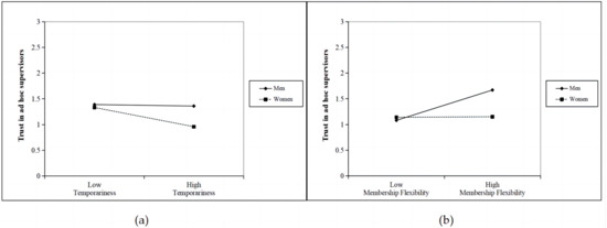 McAllister [51] argues that cognitive trust is rational in nature. It refers to an objective assessment of the other party’s functional characteristics, such as competence, honesty, integrity, quality, and reliability [51]. However, the nature of affect-based trust is relational. It refers to the emotional bond that exists between individuals and is based on reciprocal concern, compassion, and consideration. It underscores empathy, belongingness, and rapport, and forms a mutual respect for the other party. Contingent on social role theory, soft, nurturing, sensitive, and relationship-oriented traits are usually ascribed as being feminine [52,53]. Females tend to perceive interactions communally and have expectations of forming long-term social bonds, making them more altruistic but also vulnerable over the short term [54]. Female subordinates may value affective trust more than cognitive trust when compared to male followers. However, the transient nature of TPT configurations precludes the provision of relational cues, such as prior familiarity, open communication, perceived consideration, and assisting behaviors, necessary for members to build affective trust in supervisors [46]. A recognition of impending termination also indicates that the current connection with the supervisor may not develop or last. As a result, women who place a higher value on affect-based trust may be more cautious and less willing to trust than men in a short-lived relationship. In these circumstances, females are more likely to experience mistrust or even negative attitudes towards the source of strangeness [49].