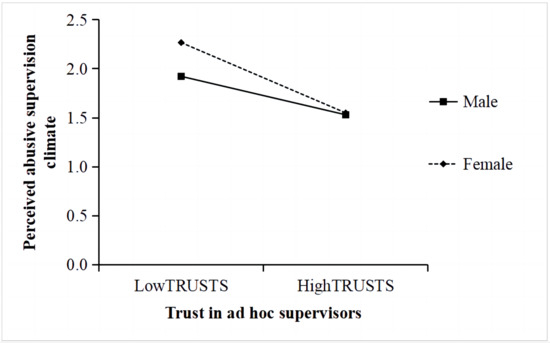Consistent with this discussion, women are stereotyped as more communal or relational in their ‘self-construal’ [53]. They place a higher priority on social harmony and make a greater effort to maintain relationships than men do. Women are also said to be more likely to weep and report feeling angry, frustrated, fearful, anxious, or underappreciated (hurt and rejected) than men [50]. Female employees may therefore be more sensitive to affective events occurring at work and more prone to associate the sentiments or emotions induced by such incidents with their perceptions of the overall work unit climate. When experiencing a superior’s offensive behavior, a female with less trust in the supervisor may take the behavior seriously and view it as a psychological contract breach within a social exchange, and thus react to it more intensively [55]. On the contrary, males tend to distinguish themselves by making obvious their autonomy, independence, and personal achievements [56]. Male employees are more inclined to place a higher value on tangible rewards in the workplace, such as remuneration or promotion, while social rewards like integration, reciprocal trust, and close relationships are considered less salient. Therefore, even if male followers lack trust in supervisors, they will be more task-oriented and concentrated on self-determination. They will also place less value on the quality of exchanges or social support. Males may view supervisory verbal assaults as less detrimental to their actual interests. As a result, this study proposes that the effect of trust in ad-hoc supervisors on abusive supervision climate perceptions is likely to be stronger for female subordinates than for their male counterparts.