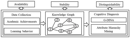 Personalized and adaptive learning support services require an accurate assessment of the current learning status of students []. Diagnosing a learner’s cognitive structure is the basis for achieving personalized instructional delivery. The diagnosis of learners’ cognitive structures requires the use of personalized systems. Figure 1 shows the process of diagnosing learners’ cognitive structures. Firstly, the personalized system utilizes different information technologies to collect multimodal data (academic performance and learning behavior, etc.) generated during the teaching process in a comprehensive and automated manner. Secondly, based on disciplinary knowledge graphs and cognitive diagnostic techniques, the cognitive structure status of learners is diagnosed. The diagnostic results are represented by the knowledge structure’s usability, discriminability, and stability.