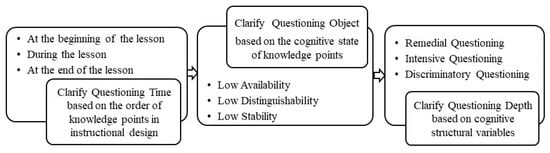 Once the subject of the question is identified, the teacher can clearly understand the learner’s cognitive structure variable state through the results of the cognitive structure diagnosis. Teachers can conduct specific analyses of situations with low cognitive structural variables and propose appropriate depth questions (as described in Section 4.2). According to the theory, before any teaching takes place, the teacher will predict the knowledge state of the student(s), that is, to figure out their Zone of Proximal Development [], which will help the teacher formulate an appropriate representation of the knowledge to be transmitted to the student(s). Questions create zones of proximal development when teachers are able to grasp their students’ prior knowledge, thinking, and inquiries to scaffold them to the next level. When the knowledge does not meet the standard, the teacher proposes the next in-depth question based on the learner’s current cognitive state of the knowledge point.