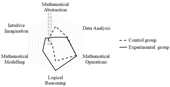 Mathematical core literacy includes six aspects: mathematical abstraction, data analysis, mathematical operations, logical reasoning, mathematical modeling, intuitive imagination. As shown in Figure 5, in terms of mathematical abstraction, the experimental group’s value was −0.001, much lower than the control group’s 0.323. In terms of data analysis, the value of the experimental group is 0.186, which is not significantly different from the control group’s 0.207. In terms of mathematical manipulation, both groups showed almost identical performance, with values of 0.5. In terms of intuitive imagination, logical reasoning, mathematical modeling, and intuitive imagination and reasoning, the experimental group’s level is much higher than that of the control group. The experimental group had values of 0.609, 0.233, and 0.144, while the control group had values of 0.323, −0.101, and 0.155, respectively. This discovery indicates that PTQ plays an important role in cultivating learners’ intuitive imagination, mathematical models, and logical reasoning, but has little effect on data analysis and mathematical operations. This strategy may have an inhibitory effect on cultivating learners’ mathematical abstraction.