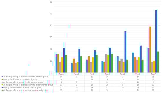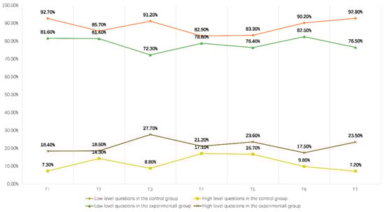 Figure 7 shows the number of questions at different depths in the experimental and control groups. In the control group, 92.7% of the classroom questions were at a lower level of cognition, and the number of low cognitive problems was much higher than that of the experimental group. On the contrary, in terms of the number of high cognitive problems, the control group had a much lower number than the experimental group, with only 7.3%, which is consistent with previous research results [,,,]. This indicates that the PTQ strategy can enhance teachers’ questioning skills and help them raise high cognitive level questions in the classroom.