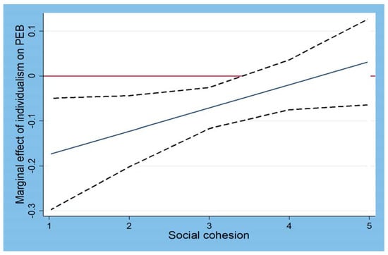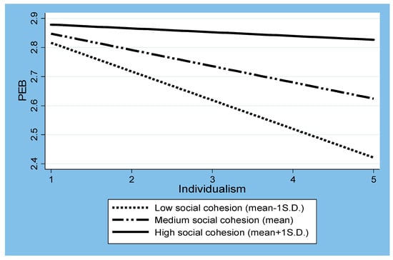 We added the interactions between individualism and social cohesion in Model 3 to better explore SET. Our findings showed that social cohesion significantly moderated the negative association between individualism and PEB ( = 0.052, p < 0.05), which supports Hypothesis 3. It is possible that social cohesion leads individualists to reciprocate favorable treatment, such as care and support from neighbors, connectedness to others, and a sense of belongingness to the community, by performing environmentally friendly activities [15,60,61].