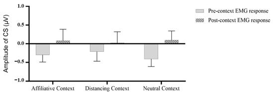 For angry faces, we conducted a 3 (Context: Affiliative, Distancing, Neutral) * 2 (Process: Pre-context, Post-context) repeated-measures ANOVA on CS activities (refer to Figure 3). The results revealed a nonsignificant main effect for context, F (2, 66) = 0.373, p = 0.69, η2 = 0.011, and a nonsignificant interaction effect, F (2, 66) = 0.188, p = 0.829, η2 = 0.066. However, a significant main effect for process was observed, F (1, 33) = 4.608, p = 0.039, η2 = 0.123. This observation implies that participants demonstrated augmented muscular activity post-context-presentation as compared to prior, suggesting that context may impart supplementary information for angry faces, thereby fortifying emotional mimicry.