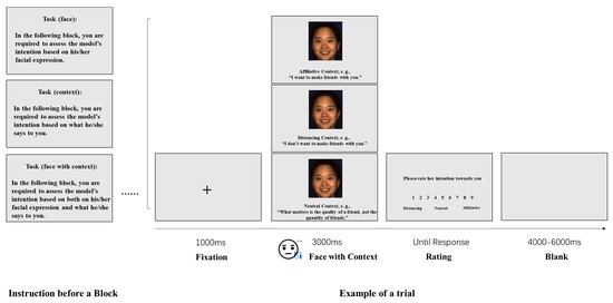 Participants were asked to imagine that they were engaged in a real-life conversation with the model displayed on the screen. As illustrated in Figure 4, prior to each block, instructions were displayed on the screen, informing participants of the task they were to complete in the upcoming block. There were three tasks: the face task, where participants were asked to focus their attention on facial expressions; the context task, where participants were asked to focus their attention on the context; and the face with context task, where participants were required to process information from both facial expressions and context. The order of blocks and tasks was counterbalanced across participants. Each trial began with the presentation of a fixation cross for 1000 ms. This was followed by a 3000 ms video clip, which depicted either happiness or anger, with a corresponding sentence displayed at the bottom of the screen. Subsequently, participants were asked to rate the degree of intention they felt towards the model (1 = completely distancing intention, 5 = neutral, 9 = completely affiliative intention). Finally, a blank screen was displayed for a random interval of 4000–6000 ms to allow facial muscle activity to return to baseline levels [19,27,28].