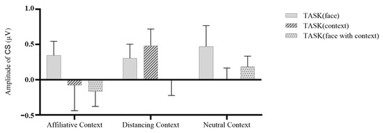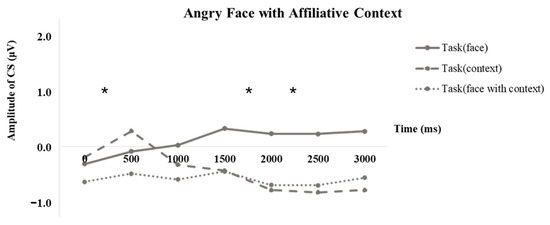 For angry faces, we conducted a 3 (Context: Affiliative, Distancing, Neutral) * 3 (Task: Face, Context, Face with Context) repeated-measures ANOVA on CS activities. As depicted in Figure 7, the results revealed nonsignificant main effects for both context, F (2, 86) = 0.922, p = 0.402, η2 = 0.021, and task, F (2, 86) = 1.984, p = 0.144, η2 = 0.044. Additionally, a nonsignificant interaction effect was observed, F (4, 172) = 1.099, p = 0.359, η2 = 0.025. However, the pairwise comparisons indicated that when participants were shown angry faces with an affiliative context, CS activity was significantly decreased in the face with context task (M ± SD = −0.166 ± 0.212) compared to the face task (M ± SD = 0.345 ± 0.199), p = 0.028.