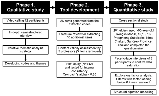 An exploratory sequential mixed-method qualitative–quantitative study was conducted to explore the specific influencing factors for participants residing in rural areas on their mask-wearing behaviors. Our study site was the border area of 4 of 19 villages in Phraphlong Subdistrict, Khao Chakan District, at the border area of Sa Kaeo Province, Thailand, 190 km east of Bangkok [14]. This area has been teaching community medicine for Phramongkutklao College of Medicine since 2002 [14]. The current study was divided into three phases. The initial phase aimed to retrieve possible reasons for mask-wearing in the community using an in-depth interview technique. In the second phase, a questionnaire was designed based on codes and themes from the prior phase. Then, the questionnaire’s reliability and validity were tested. Lastly, the questionnaire was utilized for a cross-sectional study to assess the factors influencing the participants’ mask use.