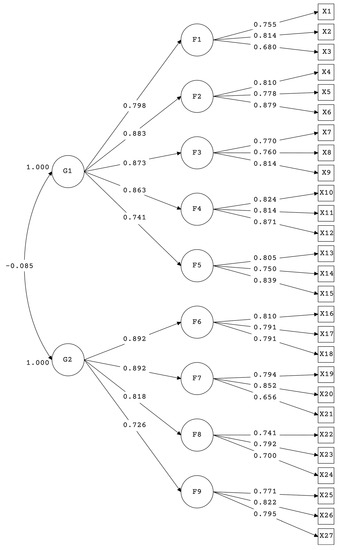 - Varela, J.; Abalo, J.J.; Rial Antonio, A.; Braña, T. Análisis Factorial Confirmatorio de Segundo Nivel. In Modelización con Estructuras de Covarianza en Ciencias Sociales: Temas Avanzados, Esenciales y Aportes Especiales; Lévy, J.P., Varela, J., Eds.; Netbiblo: Madrid, Spain, 2006; pp. 239–254. [Google Scholar]