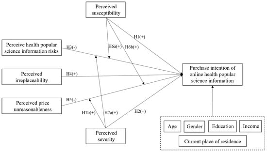 The health belief model suggests that individuals’ beliefs about health risks predict the likelihood of adopting health-related behaviors []. With respect to a disease itself, the perceived risk for a health problem consists of two aspects: perceived susceptibility and perceived severity []. Once a person perceives the health risk of a particular health problem, he or she then forms beliefs about the possibility of health problems and the severity of the disease suffered. Studies have shown that both perceived susceptibility and perceived severity can motivate individuals to actively assess their health and take appropriate preventive measures []. Mou Jian et al. found that perceived severity and perceived susceptibility can significantly and positively influence users’ acceptance of health-related services on the Internet []. In this paper, we focus on users’ purchase intentions for online health popular science information and apply the HBM to the field of knowledge payment. Most of the online health-related research involving the variable of perceived risk is based on the risk perception of the disease itself. Many scholars have used perceived susceptibility and perceived severity in health belief models to measure the perceived risk of diseases. It has been found that consumers’ perceived susceptibility and perceived severity of common health problems can significantly stimulate their intentions to purchase healthy foods [,]. Moreover, two health beliefs based on perceived susceptibility and perceived severity of diseases can significantly and positively influence users’ disease-related preventive behaviors [,]. Based on the above literature review, we believe that in this research scenario, users may be further motivated to take preventive measures, i.e., purchase paid health popular science information, when they perceive greater susceptibility and severity from the health problems involved in paid health popular science information.