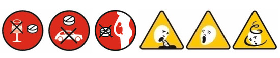 Pharmaceutical pictograms used: warning pictograms for “do not take in combination with alcohol”, “do not drive after taking”, and “do not take during pregnancy” and side effect pictograms for “can cause nausea”, “can cause tiredness”, and “can cause dizziness” (from left to right).