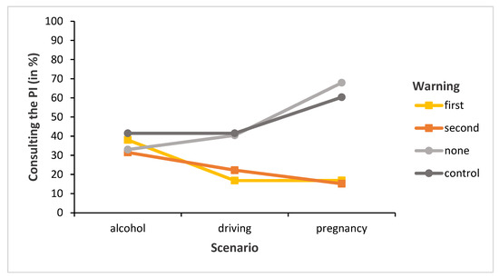 To begin with, we were interested in whether the factors warning and scenario influenced participants’ willingness to consult the PI; if so, in what ways? We, therefore, calculated a probit regression model instead of a logit model (due to a lower number of participants in the control group, the calculation was fitted into an ANOVA) with the scenario (alcohol, driving, and pregnancy) and warning (first position, second position, none, and control) factors on the percentages of the binary outcome variable (did or did not consult the PI). We found a significant main effect scenario (χ2 (2, N = 1074; note that each of the 358 participants made three decisions each, so the total number of decisions was N = 1074) = 7.02, p < 0.05) and a significant main effect warning (χ2 (3, N = 1074) = 68.67, p < 0.001). Moreover, we also found a significant scenario × warning interaction (χ2 (6, N = 1074) = 49.70, p < 0.001) (see Figure 3).