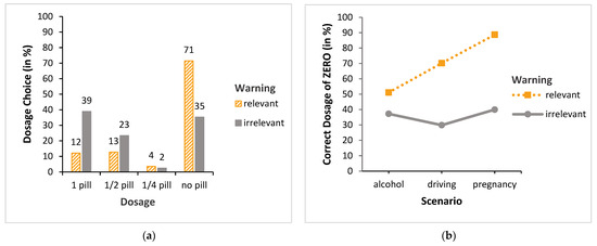 How did participants (about 34%) decide when they were informed, i.e., when they consulted the PI? [Here, in contrast to before, we found significant main effects for warning (first position and second position: χ2 (1, n = 142) = 6.87, p < 0.01, respectively; none and control: χ2 (1, n = 221) = 7.60, p < 0.01) regarding dosage, but again no significant interactions (both χ2-values < 2.00, both p-values > 0.37). These results are discussed in Section 4)]. As can already be inferred from Figure 5a, the calculated ordinal logistic regression with the factors scenario (alcohol, driving, and pregnancy) and warning (relevant and irrelevant) on the ordinal-scaled data dosage (1, ½, ¼, or no pill) showed only a significant main effect of the scenario factor, with χ2 (2, n = 363) = 36.98, p < 0.001 (warning: χ2 (1, n = 363) = 0.48, p = 0.49; scenario x warning interaction: χ2 (2, n = 363) = 0.77, p = 0.68). For the reasons stated above, the data across the incorrect dosages (i.e., 1 pill, ½ pill, and ¼ pill) were once more collapsed. Again, the calculated probit regression model with the two factors scenario and warning over the binary outcome variable (did or did not take any pill; see Figure 5b) showed the same pattern as above: There was only a significant main effect of scenario (χ2 (2, n = 363) = 37.23, p < 0.001). Neither the warning main effect (χ2 (1, n = 363) = 0.75, p = 0.39) nor the scenario x warning interaction (χ2 (2, n = 363) = 2.95, p = 0.23) was significant. A comparison (Bonferroni-corrected) across both warning conditions showed that the alcohol and driving scenarios were not significantly different (p = 0.62), but that there was a significant difference between these two scenarios compared with the pregnancy scenario, both p-values < 0.001.