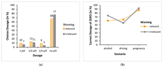 How did participants who did not consult the PI (66% overall) decide on dosage? To investigate this question, we calculated an ordinal logistic regression with the factors scenario (alcohol, driving, and pregnancy) and warning (relevant and irrelevant) on the ordinal-scaled data dosage (i.e., 1, ½, ¼, or no pill). It was found that both main effects, i.e., scenario (χ2 (2, n = 711) = 29.75, p < 0.001) and warning (χ2 (1, n = 711) = 86.74, p < 0.001), became significant. Furthermore, the scenario x warning interaction also became significant (χ2 (2, n = 711) = 14.27, p < 0.001) (see Figure 4). We again found no significant main effects for warning (first position and second position, respectively, none, and control) regarding dosage (both χ2-values < 1.39, both p-values > 0.24), nor any significant interactions (both χ2-values < 3.88, both p-values > 0.14). Accordingly, Figure 4a shows that, in the relevant warning condition, 71% of the participants made the correct choice (no pill), compared with only 35% in the irrelevant condition. Because of the small number of cases for some dosages (e.g., ¼ pill), the data were collapsed across the incorrect dosages (i.e., 1 pill, ½ pill, and ¼ pill). Subsequently, we again calculated a probit regression model with the two factors scenario and warning, but this time over the binary outcome (did or did not choose “no pill”). The pattern described above was confirmed: again, both main effects (scenario: χ2 (2, n = 711) = 37.01, p < 0.001 and warning: χ2 (1, n = 711) = 74.76, p < 0.001), as well as the scenario x warning interaction (χ2 (2, n = 711) = 17.65, p < 0.001), became significant (see Figure 4b).