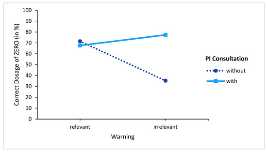 Importantly, overall, the PI was read more frequently in the irrelevant condition (48%) than in the relevant condition (23%). In the pregnancy scenario, only 16% of the participants consulted the PI in the relevant conditions—is this wise in terms of choosing the correct dosage? If the illustrated pictograms convey the intended information, then yes, otherwise no. In the next sections, we, therefore, consider the dosage decision first separately with and without PI consultation and then overall at the end.