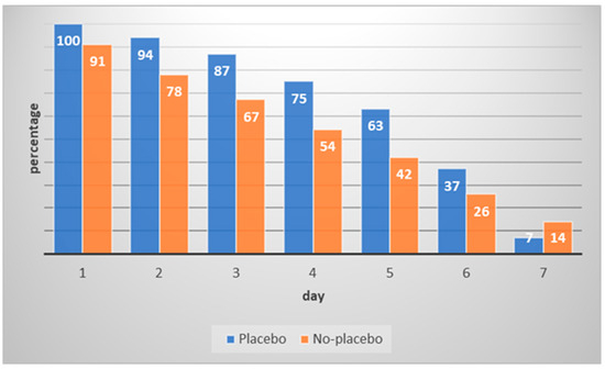 The percentage of completed AoKs per day and group is depicted in Figure 1. Over the one-week interval, there was a strong decline in the number of AoKs. The placebo group completed more AoKs (M = 5.83, SD = 1.55) than the no-placebo group (M = 5.19, SD = 1.82, t(157.3) = 2.40, p = 0.018; Cohen’s d = 0.38; 95% CI [0.06, 0.69]). Eleven participants (7%) conducted more than the required seven AoKs (range: 8–11). Six participants were in the placebo group; five were in the no-placebo group.