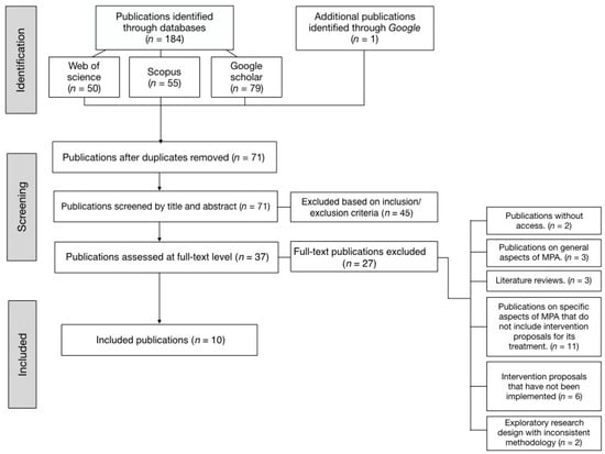 Progress in this scientific area has been hindered by a scarcity of publications utilizing methodologies that are both valid and reliable []. Therefore, it is advisable to comprehensively accumulate information to significantly enhance our comprehension of this subject. With an absence of studies amalgamating the scientific advancements achieved over the last half decade, the principal objective of this article is to meticulously examine the intervention strategies addressing the issue of MPA implemented from 2018 to 2023.