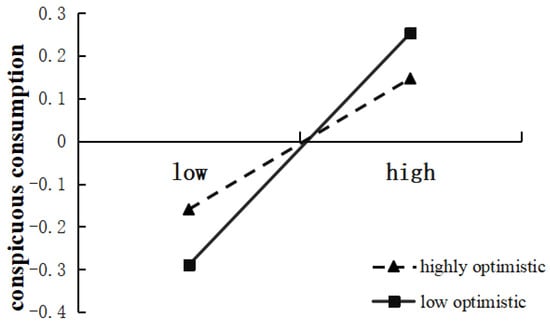 In addition, according to psychological compensation theory [,], when individuals are unable to solve a need by their original means, they tend to choose other ways to satisfy the need as an alternative. When faced with upward social comparison information, individuals with low optimism levels think that it is difficult to compensate for the enormous difference between themselves and upward comparators through effort and may choose to compensate through other means, such as conspicuous consumption. Compared with acquired efforts, conspicuous consumption can help low-optimism individuals reduce the difference between themselves and others in a more convenient and faster way and close the positive image in the mind of individuals. In contrast, individuals with high levels of optimism may take active steps to try to reduce the differences between themselves and others when they experience pressure from upwardly mobile objects, and the protective effect of optimism weakens the contrast effect of upward social comparison and further weakens individuals’ tendency to consume ostentatiously. Thus, individuals with low levels of optimism are more likely to engage in conspicuous consumption after experiencing upward social comparisons on social networking sites.