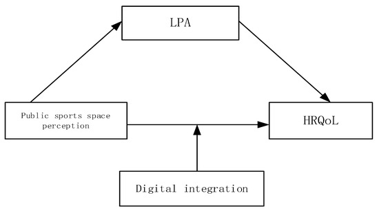 In addition, changes such as COVID-19 have become an incentive to encourage middle-aged and elderly people to use digital technology and narrow the digital divide [19]. Compared with traditional media, digital integration will significantly affect the health of middle-aged and older adults [20], play an important role in promoting health, social participation, and security, and is also an important way to improve the quality of life of middle-aged and older adults, increase happiness, and promote active aging [21,22,23]. Digital integration can also improve the perception of public sports space [24]. Digital technology can provide more real-time information, such as air quality, weather conditions, and public facilities, which can help middle-aged and older adults to better understand the use and safety of public sports spaces and improve their perception of public sports spaces. Therefore, we propose the fourth hypothesis of this study, that digital integration has a modulatory role in the impact of the perception of the public sports space on health-related quality of life for seniors in the community.