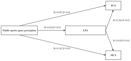 According to Table 2, the results show that the perception of public sports space by community middle-aged and older adults has a significant positive predictive effect on MCS (β = 0.193, p < 0.01). After introducing the mediator variable, the positive predictive effect of public sports space perception on MCS remains significant (β = 0.182, p < 0.01). The perception of public sports space has a significant positive predictive effect on the frequency of LPA (β = 0.026, p < 0.01), and the frequency of LPA has a significant positive predictive effect on MCS (β = 0.850, p < 0.01).
