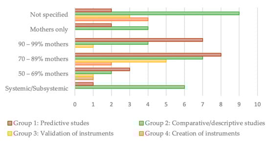 The percentages of the five groups of studies are stated below in descending order. The largest group (33% of the total studies) comprised 22 studies, with the participation of mothers ranging from 70% to 89%. The second group, comprising 24% of the total studies, was represented by 16 studies that did not specify the profile of the participant. The third group, consisting of 23% of the total studies, was represented by 15 studies with 90% to 99% participation of mothers. The fourth group comprised 11% of the total studies and corresponded to 11 studies, with 50% to 69% of mothers participating. Finally, 9% of the total studies were represented by six studies where only mothers participated. In five of the six studies, the researchers explicitly invited only mothers to participate, while in the remaining study [73], the authors invited a member representing their respective families to participate, but only 10 mothers agreed to participate.