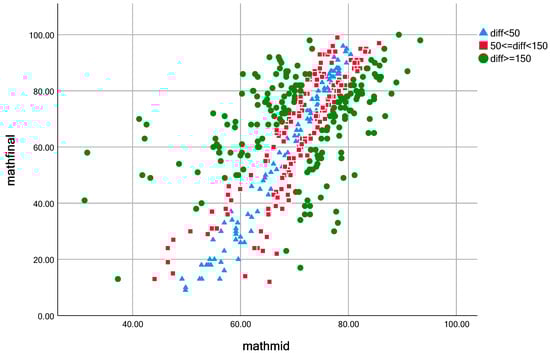 Based on the students’ two-time academic performance in mathematics, we obtained the regression coefficients and , which were 1.446 and −36.243, respectively, to obtain the regression equation .