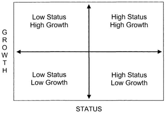 Figure 2 is the “status and growth map” proposed by Weiss et al. (2008) [], which provides a good illustration of how to consider the status and growth of student achievement. It divides the four areas based on a reference line according to “growth” and “status”, representing four different groups.