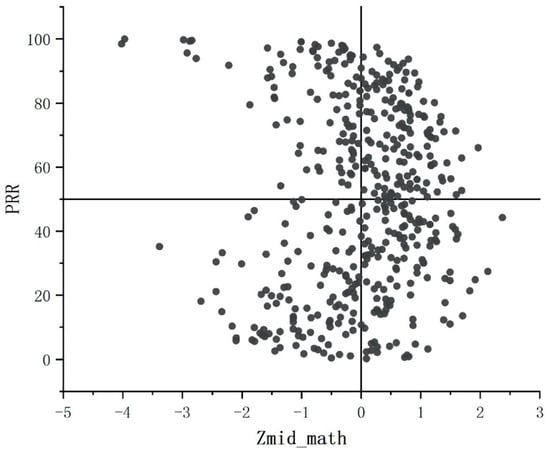 The number of students located in each quadrant in Figure 3 is 138, 94, 111, and 120. The scatter density falling in the first quadrant was higher, which means that the students with a high academic foundation in mathematics had a greater chance of achieving high value-added scores. The scatter density in the second quadrant was the lowest, which means that the students with a poor academic foundation in mathematics had a lower chance of achieving high value-added scores. The mean values of PRR in the four quadrants were 70.6185, 81.5794, 20.7441, and 29.0461, respectively, and the value-added performance (PRR) of students with low initial scores in the second quadrant was closer to 100. Additionally, their mean PRR values were significantly higher than those in the first quadrant, which was also a high value-added area.