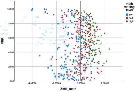 When examining the value-added scores of the students’ performance in mathematics, we must acknowledge the fact that there was a relationship between academic growth and academic fundamentals. However, the two were not necessarily positively correlated. It is also common to encounter students with a low academic foundation but high growth, and students with a high academic foundation but low growth. Table 3 shows the results of the Pearson correlation between mathematics performance, PRR, and mathematics reading.