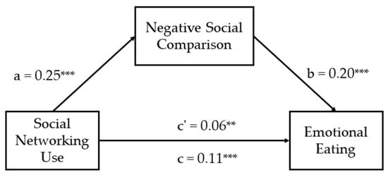 This study employed the bias-corrected percentile bootstrap method from the SPSS macro PROCESS developed by Hayes [] to test the core hypothesis of this study: whether negative social comparison mediates the relationship between social networking use and emotional eating. When using this method, Model 4 was selected, with 5000 iterations of resampling performed to compute a 95% confidence interval.
