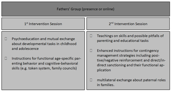 The father-group was developed as a structured father-centered gender-specific family intervention program at our Department of Child and Adolescent Mental Health, University Hospital Erlangen, Germany, to reduce paternal stress and to increase paternal parenting self-efficacy and competence. In the present study, the father-group study was conducted in two cohorts: group 1, in person (starting October 2020), group 2, online (starting February 2021). Both cohorts underwent two intervention sessions (of 90 min) with a three-week interval. The interventions were led by two male child and adolescent psychiatry professionals. In a group therapy setting for relatives, fathers received therapeutic and pedagogical instructions for a daily routine for dealing with their mentally ill children, with specific emphasis on educational/parenting difficulties and related differences across developmental periods. Subjective paternal tasks and challenges in parenting and child development were particularly identified and addressed, including possible solution strategies. Paternal roles and parenting styles were reflected in systemic family contexts, and cognitive–behavioral/contingency management strategies for parenting, like token systems and family councils, were conveyed. A large focus of the group intervention was on mutual exchange between the participants. The intervention design was partially based on the German therapy manual for parents of mentally ill children ‘Eltern stark machen’ (Eng.: ‘Strengthen Parents’) [46]. The detailed content of both intervention sessions is summarized in Figure 1.