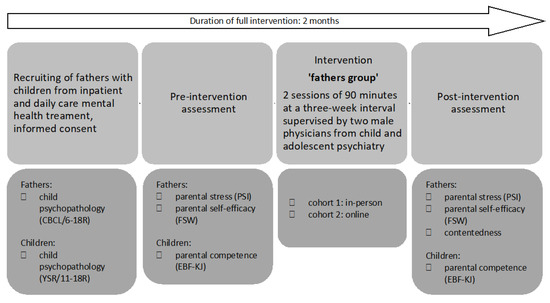 Father–child dyads were recruited from the inpatient and daily care units of our Department of Child and Adolescent Mental Health, University Hospital Erlangen, Germany. Informed consent (adults) or assent (minors) was obtained from all participants involved. The study was approved by the Local Ethics Committee of the University Hospital, Erlangen (380_20 B) and was conducted in accordance with the Declaration of Helsinki. Inclusion criteria were current treatment of the father’s child at our Department and provision of informed consent and assent, as well as participation in all assessment and intervention sessions. Participant dyads were excluded if regular attendance was not provided and if either father or child did not agree to the study participation. At the pre-intervention assessment (inpatient/day clinic admission), fathers and children answered standardized questionnaires regarding child psychopathology. In a pre-/post-test assessment, fathers self-reported subjective parental stress and PSE in a paper-and-pencil format. Likewise, children rated paternal competence levels via questionnaires. Figure 2 shows the detailed intervention and evaluation protocol.
