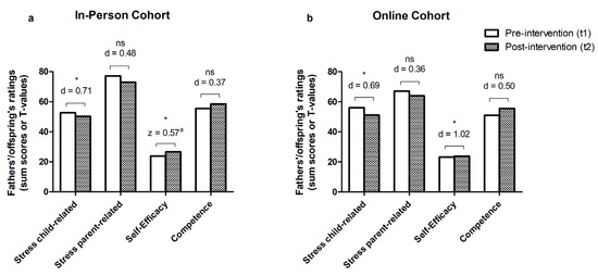 Pre-/post-intervention comparisons of father’s child- and parent-related stress, self-efficacy, and competence in the in-person (a) and online (b) group format. Stress child-/parent-related: PSI: Parenting Stress Inventory [49]; self-efficacy: FSW: German questionnaire ‘Fragebogen zur Selbstwirksamkeit in der Erziehung’ [50], competence: EBF-KJ: German questionnaire ‘Elternbildfragebogen für Kinder und Jugendliche’ [51], ns: not significant, * p < 0.05, |d|: Cohen’s d/t-test effect size [for parental self-efficacy in the in-person cohort, Wilcoxon signed-rank test was performed instead of t-test. a z for the effect size of Wilcoxon signed-rank test)].