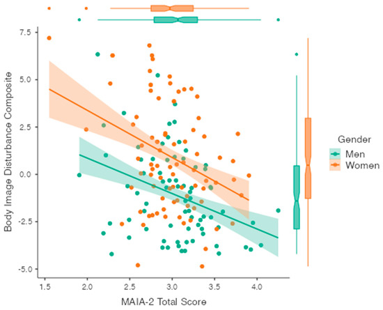 Scatter plot showing composite body image disturbance scores on the y-axis and interoceptive sensibility on the x-axis with separate regression lines plotted for men and women. Boxplots for MAIA-2 and body image disturbance composite scores are displayed on the sides of the plot.