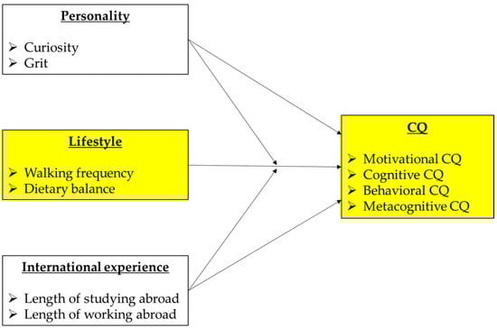 However, as compared to the outcomes of CQ, the research on the antecedents of CQ is still inadequate [7]. Therefore, it remains rather unclear how an individual develops or strengthens CQ. The majority of articles regarding the antecedents focus on the international experience or cultural exposure (including related training/education) to develop CQ [8,9,10], while others examine individual differences in personality traits [11,12,13]. However, the relationship between both overseas experience and personality traits and CQ is not strong [3,7]. Therefore, a significant factor that could be improved upon is the comprehensiveness of antecedent variables of CQ, which has not been seen in previous studies. In this sense, we have not come across any study that has employed variables related to lifestyles. If CQ is related to brain activities as advocated by CQ developers [14,15], it is worthwhile to test the association between lifestyle variables and CQ. This is because research in brain science has clarified the relationship between lifestyles and brain conditions [16,17,18], which indicates the consequent association between lifestyles and CQ. Based on this understanding, in this research, we test the association of CQ with such lifestyle variables, adding to the variables related to international experience and personality traits by using businesspersons who were recruited in Japan. As CQ scholars have called for a greater examination of CQ antecedents beyond international experience and personality [7,19], we assume that the current study could respond to such calls. This paper is the first study to examine the possibility that lifestyle variables can be predictors of CQ from a health science perspective. To this end, we use structural equation modeling (SEM) to show that two lifestyle variables (walking frequency and dietary balance) are correlated with CQ when controlling for personalities (curiosity and grit) and international experiences (length of studying/working abroad), which have been used as predictor variables of CQ,