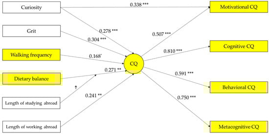 The results of the structural equation modeling. Note: n = 142, *** p < 0.001, ** p < 0.01, * p < 0.05. Goodness-of-fit indices: χ2 = 29.923; df = 33; root-mean-square error of approximation (RMSEA) = 0.000; probability of close fit (PCLOSE) = 0.932; goodness of fit index (GFI) = 0.965; adjusted goodness of fit index (AGFI) = 0.929; normed fit index (NFI) = 0.948; comparative fit index (CFI) = 1.000. Errors and covariances are omitted in the figure. The covariances are as follows: curiosity and walking frequency (0.185 *), length of working abroad and grit (0.177 *), walking frequency and length of working abroad (−0.178 *), curiosity and grit (0.168 *), length of studying abroad and interaction term (0.856 ***), dietary balance and interaction term (−0.185 ***), error of motivational CQ and error of behavioral CQ (0.441 ***), walking frequency and error of behavioral CQ (0.180 *), error of metacognitive CQ and length of working abroad (−0.248 *), and error of cognitive CQ and dietary balance (−0.283 *). ☨ path from interaction term to CQ (−0.345 *); path from length of studying abroad to CQ (0.519 **). Yellow variables are main variables in this study, others are covariates; circles are latent variables, and squares are observed variables.