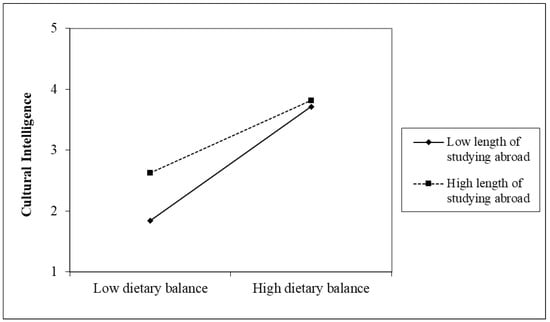 Furthermore, the mean-centered interaction terms of the four main explanatory variables and the two foreign experience variables were input. As a result, only the interaction term of length of studying abroad and dietary balance became significant. To further understand the meaning of the significant interaction terms, in Figure 3, the data were divided into a group with high length of studying abroad and a group with low length of studying abroad, in which the horizontal axis shows the group with high dietary balance and the group with low dietary balance and the vertical axis shows CQ. The criteria for high and low are whether the score is 1 SD higher or lower than the average, following the recommendation by Aiken et al. [70]. CQ is high regardless of the length abroad when the dietary balance is high, but CQ is lower in the group with a low length of studying abroad than in the group with a high length of studying abroad when the dietary balance is low. This indicates that people with less overseas experience are more likely to increase their CQ by improving their dietary balance.