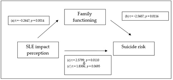 We followed standard methods to develop the mediation model via bootstrapping, with our results meeting the four criteria described above (see Figure 1). We found that (1) SLE impact perception significantly correlates with suicide risk; (2) SLE impact perception significantly correlates with family functioning perception; (3) family functioning perception significantly correlates with suicide risk, and this relationship remains significant when controlling for SLE impact perception; and (4) the relationship between SLE impact perception and suicide risk decreases when controlling for the potential mediator (family functioning perception). The model accounted for 13% of the variance (see Table 4). Studying the indirect effect via bootstrapping supports a partial mediation model, as the indirect effect is significantly different from zero at p < 0.05 (0.0067; [CI: 0.0018 to 0.0150]).