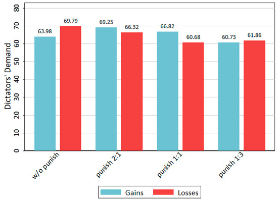 Nevertheless, our study has some limitations. First, our sample consists of students from various fields of study and they were recruited from two subject pools located at two German Universities (Leipzig and Magdeburg). These aspects are considered to limit the generalizability of our results, especially in light of the results of studies comparing fairness behavior of students versus nonstudents. These studies regularly find that students decide in a more self-interested way [54,55]. It would be interesting to replicate the experiments with a more diverse sample in other countries. Second, overall, the statistical evidence for our results is rather weak. Though we have close to 50 decisions per condition, this is still due to the rather low case numbers that are typical for experimental designs. More importantly, our research population is already quite fair. On average, dictators in DG experiments demand around 72% [14]. However, in our control condition, the average demand is lower, with 64% for gains and 70% for losses. Consequently, there is less space left for the effect of sanctioning on fairness behavior. For that reason, further research is required.