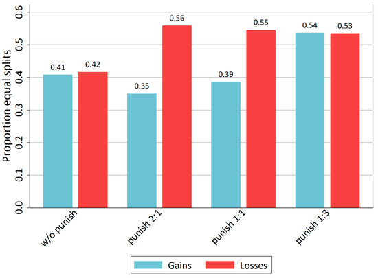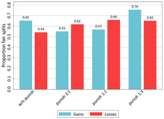 If we stick to Bicchieri’s [52] dictum, namely that deviations of ±10% from equal sharing might still be seen as adherence to the norm and, thus, fair sharing, the data can be interpreted in this way. Therefore, we define all divisions where the dictator’s demand is between 40% and 60% of the pie as fair. These figures are shown in Figure 3. The loss domain shows an increase in the proportions of fair splits for all three punishment conditions compared to the control treatment without punishment possibility. In the gains domain, this pattern is different. The strong punishment exhibits an increase in fair splits from 65% to 76%, but for weak and moderate punishment conditions, norm conformity decreases. Namely, the proportion of fair splits decreases from 65% to 55% for weak punishment and 57% for moderate punishment. For gains, Hypothesis 3 seems to hold: Introducing a weak punishment mechanism makes dictators even less fair. However again, these differences are not statistically significant.
